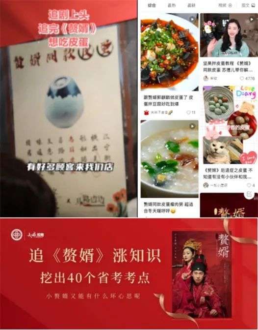 《赘婿》更已经带动各个行业制造话题,金融、情感、司法、美食、职场等各个领域纷纷联动。剧中提到的“做空”、“拼刀刀”等知识有了“《赘婿》同款教程”;皮蛋更成为2021最红单品;甚至消防部门也纷纷下场,科普在木结构的城区里燃放信号烟火的危险性。