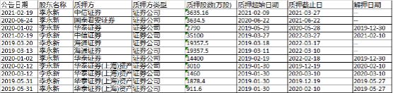 图为李永新历次质押股票情况;数据来源:wind