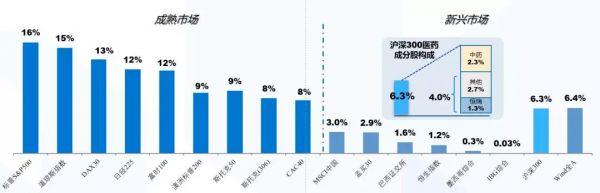 从医药版块在股市中的成熟度来看,目前A股医药总市值权重约6%,低于成熟市场8%以上的水平,远低于美国15%以上的水平。而港股恒生指数的医药股市值权重则同样被划归为“新兴市场“阶段,占比仅有1.2%。