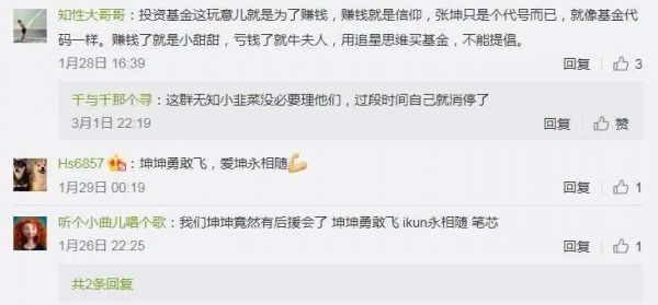 受到此待遇的还有易方达基金经理张坤。此前,张坤因骄人的管理业绩,有粉丝自发在微博上组建了易方达基金经理张坤全球后援会,并且在超话社区打榜,把“张坤”推上了热搜。“坤坤勇敢飞,ikun永相随,坤坤不老,蓝筹到老。”“追蔡徐坤,你给他花钱。但追张坤,他给你赚钱。”“守护全世界最好的坤坤。” 但面对基金净值大跌,手中的收益由正转负,部分粉丝口中的“Ikun”也变成了“菜菜坤”“菜虚坤”。