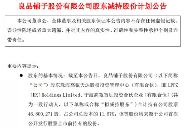 2月26日,良品铺子发布了一份股东减持计划公告,预披露了公司第三大股东高瓴资本,计划减持良品铺子不超过6%的股份。