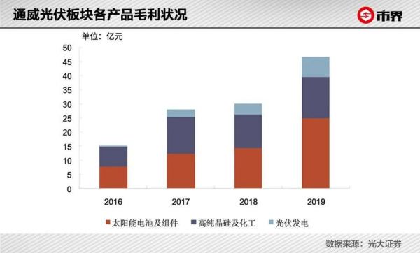 据光大证券统计,通威近4年多晶硅及化工业务平均毛利率为 34.77%,光伏发电业务平均毛利率为 47.84%,而太阳能电池及组件业务的平均毛利率仅19.57%。