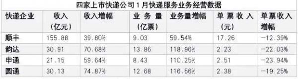 以顺丰为例,其1月速运物流业务收入同比增长39.8%;业务量同比增长59.54%;单票收入17.26元,同比下降12.39%。
