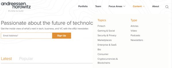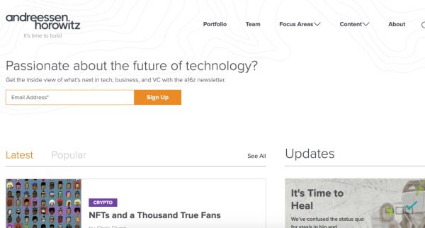 打开 a16z 的官网,你会发现它完全不像其他风投的官网那般严肃,反而像一个生动有趣的科技媒体。在网站最显眼的地方写着:对技术的未来充满热情?借助a16z新闻简报,深入了解技术,商业和VC领域的下一步。