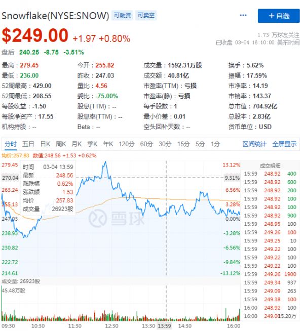 受上一季度净亏损的影响,公司股价有所下滑,但是投资者对这一高速成长的公司仍然信心十足。北京时间3月4日凌晨,snowflake发布了第四季度财报。财报显示Q4营收为1.9亿美元,同比增长117%,净亏损1.99亿美元,同比扩大。