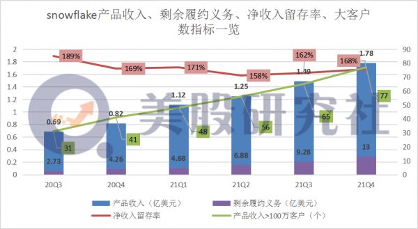 但雪花公司对已有的服务客户的维护还是不错的,从净留存率来看,雪花公司Q4的净收入净留存率NDR为168%,一直保持在高位。