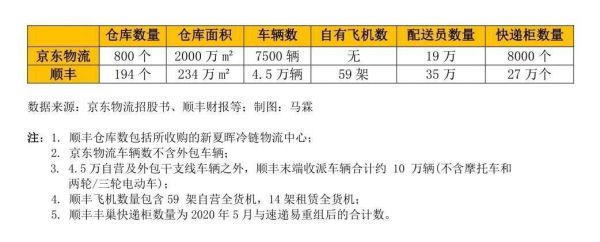 根据京东物流和顺丰在仓库和配送基础设施方面的最新数据也可以看出,京东物流在仓库数量、仓库面积上占据上风。顺丰的配送员数量则远高于京东物流,在俗称“地网”和“天网”的干支线车辆、全货机、散航、无人机方面布局更深。