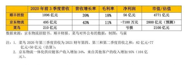 此前有媒体认为,京东物流目前的估值在2600亿元左右,其2020年前三个季度的营收规模近500亿元,还未盈利;京东在美股和港股的市值是9000多亿元,2020年前三个季度营收达5200亿元,运营利润90亿元。京东物流的营收不到京东的1/10,但短期估值可能会是京东的1/4多,可见资本市场对于京东物流有相当高的期待。