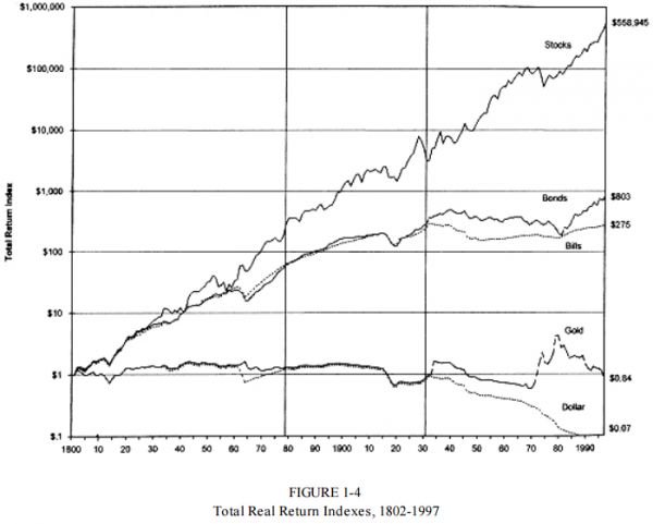这张图的意思是,如果有人在1800年把一美元现金留作现金,那么它在1997年值0.07美元。如果这一美元在1800年被用来买了黄金,那么它在1997年值0.84美元。如果在1800年买了债券,那么它在1997年值803美元。如果在1800年投入了股市(这里指的是S&P500指数),那么它在1997年值558,945美元。
