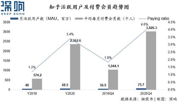 而知乎的平均月付费用户数则为302.6万,同比大幅增长189.8%,用户付费率也从2019年四季度1.8%提升至2020年的4.0%,实现翻倍增长。