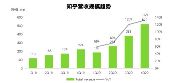 此外,知乎于2020年初推出的商业内容解决方案自开始至今的表现也惹人注意,全年收入达到1.36亿,虽然起步较晚,但其应收贡献却从1Q20的1%快速增长至4Q20的15%。