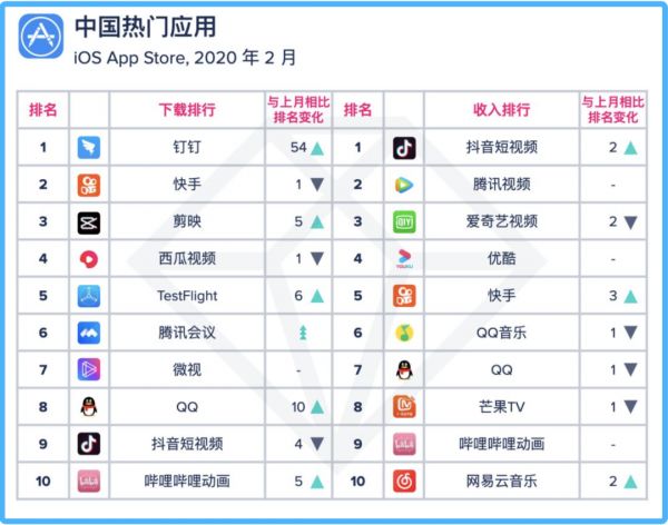 移动数据分析机构APP Annie显示,2020年2月,由于各大企业和学校相继推行“线上返工”和“云上学”的政策,钉钉下载量出现井喷式增长,当月环比增长超300%,位居国内热门应用下载榜榜首;“腾讯会议”下载量也跃升至排行榜第6位,环比增长超10倍。