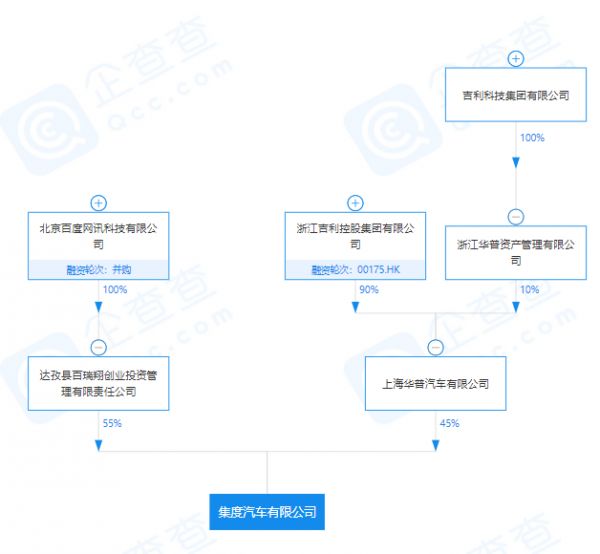 百度与吉利在3月2日成立了集度汽车有限公司,百度全资子公司达孜县百瑞翔创业投资管理有限责任公司持有集度汽车55%的股权,吉利控股的上海华普汽车有限公司持有集度汽车45%的股权。公司实际控制人与最终受益人为李彦宏,持有54.725%股份,公司注册资本为20亿元人民币。