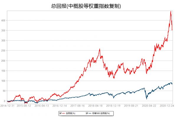 2015年1月1日以来中概股等权重指数上涨410.36%,大幅跑赢标普500指数,相对回报率为361.43%,总体表现明显优于美股大盘。