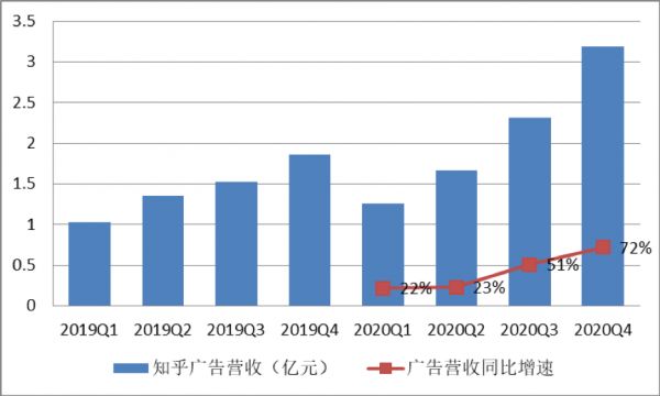 不过,此后受到广告行业整体不振影响,知乎的广告变现也没能长期维系这样的高增速。直到2020年下半年,也是得益于整体经济环境变好,知乎的广告收入才再回高速增长轨道。