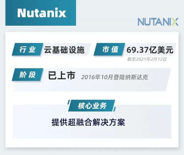 Nutanix是全球私有云和混合云的领军企业。传统企业自建机房或者数据中心,需要分别采购存储、网络和计算服务器,然后再花费大量人力物力将软硬件资源整合在一起,工程非常巨大。Nutanix用超融合架构和虚拟化技术,整合了存储、网络和服务器资源,给企业提供一站式解决方案。