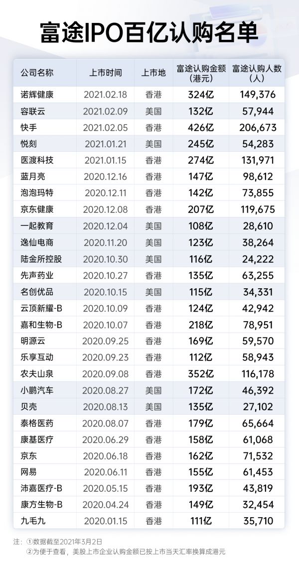 无论是承销/分销数量,还是分销成绩,富途在美股、港股都遥遥领先——自2020年以来,富途共创造了27个认购超过百亿的IPO案例,诺辉健康、快手、容联云、悦刻、陆金所、贝壳、小鹏汽车、农夫山泉、京东健康、蓝月亮……等耳熟能详的新经济企业,都悉数在富途「百亿打新俱乐部」的名单之上。