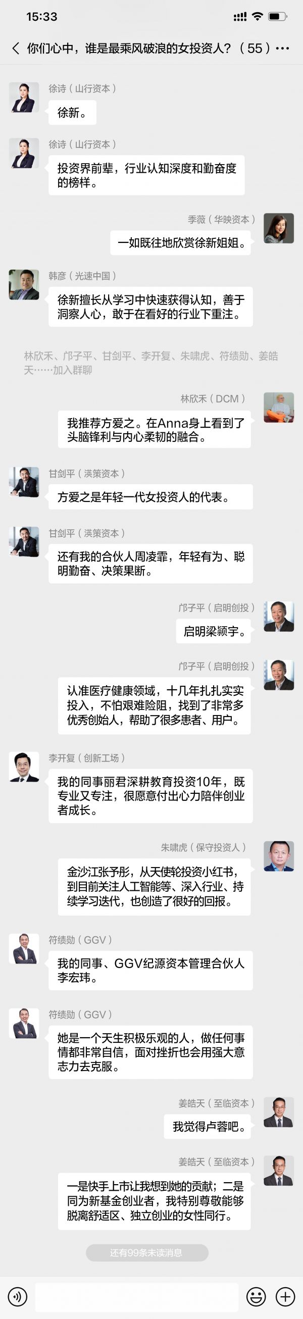 徐晨 (CMC资本合伙人):徐新,主要是对于她坚定自己的赛道和打法表示钦佩,而且的确是敢于下注 。Anna Fang,方爱之的直觉很准,值得学习,做早期保持一种敏锐的直觉是不容易的。