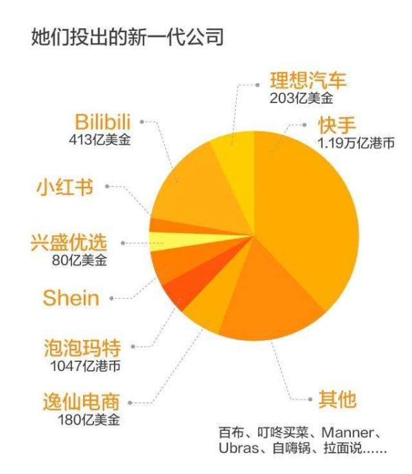 她们投出的公司除了小米、京东、滴滴、网易、字节跳动等之外,还有众多新经济领域更新出现的“大块头”,比如:快手(1.19万亿港币)、Bilibili(413亿美金)、泡泡玛特(1047亿港币)、理想汽车(203亿美金)、Shein、逸仙电商(180亿美金)等。