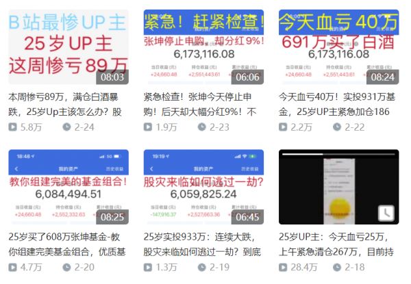 而那些活跃在各个社区、缺乏资质的“野生基金大神”,也在持续下跌的行情中露出了真面目。做基金实操展示的UP主“蛋黄哥-千万基金实投”的视频标题,从年初的《赚爆,冠军基一年涨183%》,变成了现在的《25岁最惨UP主》《血亏117万》等。