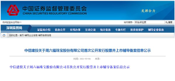 近期,深圳证监局官网披露,周六福珠宝股份有限公司拟首次公开发行股票并在境内证券交易所上市,现已接受中信建投证券股份有限公司的辅导。