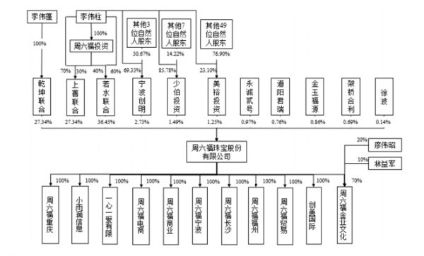 周大福就是诞生于水贝。周六福的当家并不姓周,而是由来自广东潮汕的李氏兄弟创办,2002年弟弟李伟柱因一次偶然的机会结缘珠宝,决意辞了在银行的铁饭碗,在深圳水贝村创办了一家珠宝镶嵌厂,随后哥哥李伟也加入,兄弟两人联手2004年在水贝珠宝首饰集中区成立了公司,生意做得还算顺风顺水。根据最新招股书显示,目前二人共同持股94.58%,其中,李伟柱直接、间接持股67.24%,是公司法定代表人。