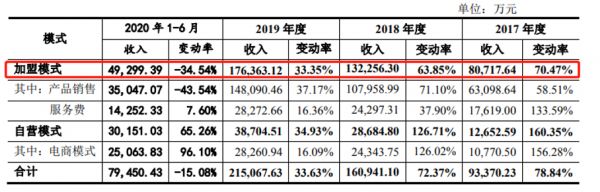 报告期内,周六福的加盟模式收入分别为8.07亿元、13.23亿元、17.64万元、4.93亿元,占主营业务收入的比例分别为86.45%、82.18%、82.00%和62.05%,占据其营收的大头。