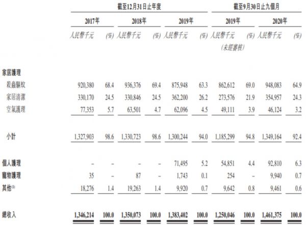 招股书显示,2017年至2020年前三季度,朝云集团分别实现营收13.46亿、13.50亿、13.83亿和14.61亿,净利润分别为1.70亿、1.77亿、1.84亿和2.15亿。其中,杀虫驱蚊产品撑起了半壁江山。2017年至2020年前三季度,杀虫驱蚊产品收入占营收比分别为68.4%、69.4%、63.3%、64.9%,均超过了六成占比。