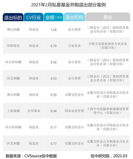 2021年2月,共计4支私募基金以并购的方式成功退出,回笼金额约4.22亿元。