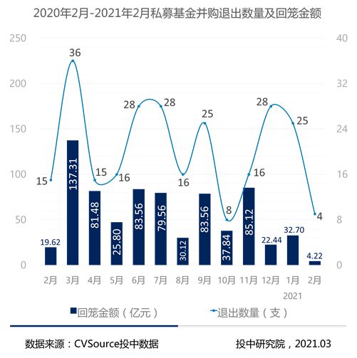 图3- 2020年2月-2021年2月私募基金并购退出数量及回笼金额