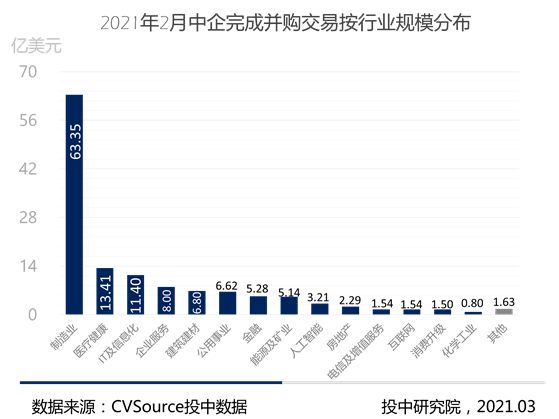 图6- 2021年2月中企完成并购交易按行业规模分布