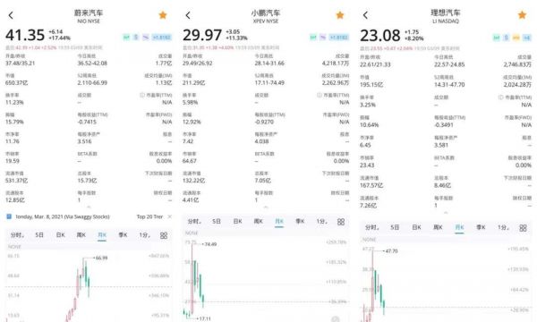 伴随财报发布与港股上市传闻的,是新三大在美股的暴跌。截止3月9日美股收盘,蔚来每股报41.35美元,较66.99美元高点跌去约1/3,理想每股报23.08美元,较47.70美元高点跌去约一半,小鹏每股报29.97美元,较74.49美元高点跌去约60%。