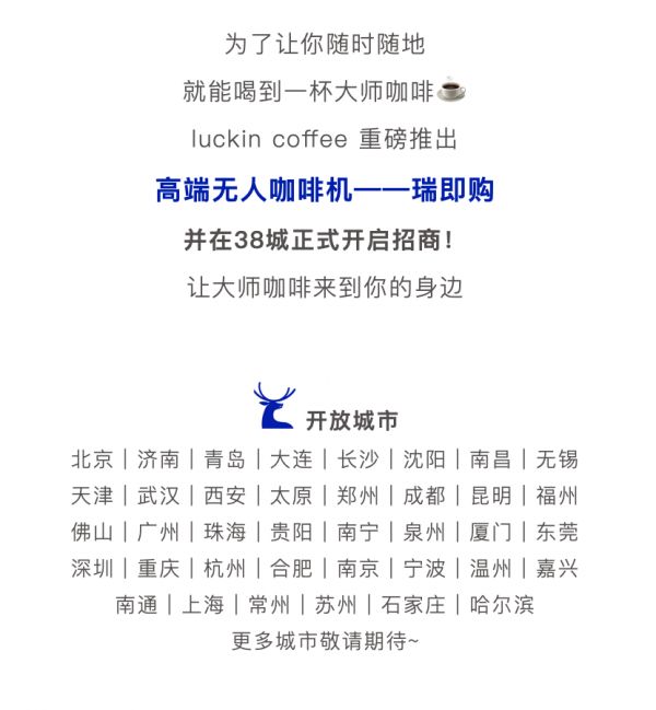 近日,瑞幸官方微信公众号发布了一则通知,瑞幸咖啡无人咖啡机瑞即购(luckin coffee EXPRESS)在38城正式开启招商。这是瑞幸咖啡曾经的“核心战略”暂停拓展10个月后,首次重启招商。