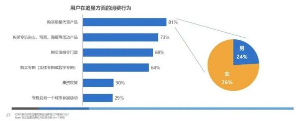CBNData《报告》指出,由于年轻消费者更愿意为明星同款支付溢价,明星各品类跨界周边带动了粉丝经济不断升温。90后尤其喜欢购买明星同款,其中女性贡献了3/4的消费。36氪研究院发布的一份《粉丝经济下的用户行为观察报告》也显示,购买明星同款的粉丝中,女性占比为76%,男性仅为24%。