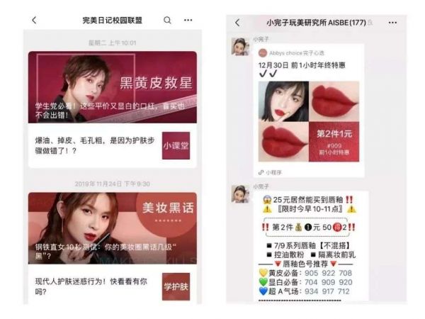 在每一款完美日记的产品之中,都会有一张“口令红包卡片”,上面会有完美日记微信服务号二维码以及“小完子”个人微信号。在完美日记内部,所有微信群中的运营人员,统一使用名为“小完子”或“小美子”的个人微信号。对外宣传中,二人被描绘为“不仅懂专业的美妆知识也是懂你的朋友”,而在完美日记内部“小完子”对应的岗位名为“粉丝运营专员”,平均月薪5000~10000元。当用户通过扫描产品红包卡上二维码添加“小完子”为好友后,小完子便会把用户拉入微信群中。