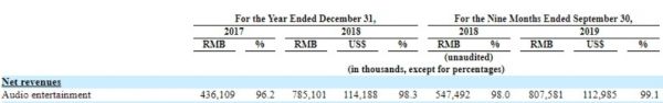 先看看荔枝的收入组成,在招股书中,荔枝将自己定义为UGC在线音频平台,说的是声音的故事,我们可以简单理解为一个“声音”的直播间,而这样的平台,荔枝的主要收入来自于用户对播主的打赏礼物,即来自于音频的收入。