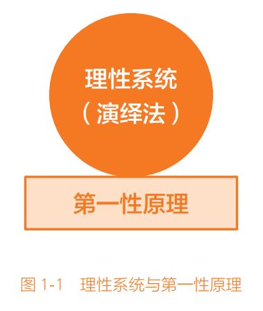 换句话说,任何理性系统内部都是用演绎法来推论的,而推论必须建立在第一性原理之上,我把它画成一个模型(见图 1-1)。这里我把第一性原理放在理性系统之外,它是系统的大前提,由它加上演绎法,推出整个理性系统。