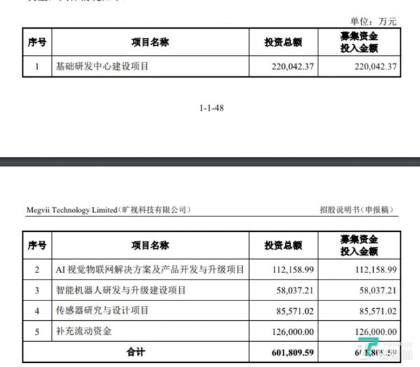 此次如果顺利通过科创板上市审批,旷视计划公开发行不超过2.53亿份CDR,将从中国资本市场中募集资金60.18亿元人民币。其中约三成(22亿元)用于建设基础研发中心;约五成投入到AI物联网解决方案、智能机器人、传感器等研发项目中;剩下不到两成(12.6亿元)用于补充运营流动资金。