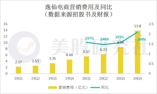 从成本方面来看,逸仙电商Q4成本6.61亿,同比增长55%,创了新高。不光成本扩大,费用方面支出变化也不小。从财报数据来看,Q4营销费用支出13.8亿元,同比扩大209%,较去年翻了两倍多,可见营销力度之大。