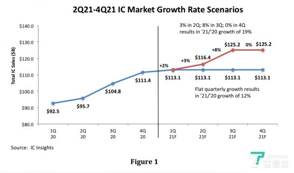 其中,IC Insights认为,如果1Q21/4Q20的IC总销售额增长2%至1131亿美元,并且从2021年二季度到2021年四季度持平,那么2021年全年的全球IC市场将录得12%的增长。如果适度季度预期(第二季度增长3%,第三季度增长8%和第四季度增长0%)纳入考虑范围,那么今年全球IC市场将实现19%的增长。
