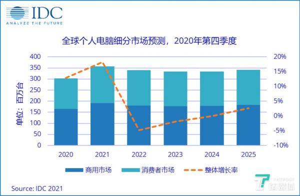 2020年,PC出货量增长了12.9%;预计这一势头将延续到2021年。IDC预测,2021年传统PC市场将增长18.2%,出货量将达到3.5亿台。展望未来,数据仍然高于历史水平,2020-2025年预测期内复合年增长率(CAGR)为2.5%。