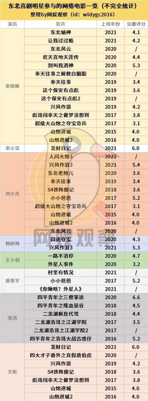 除了高产的宋晓峰、刘小光,杨树林、王小利、唐鉴军、张浩、文松、贾冰等,都在网络电影领域里建立起清晰的观众认知度。这些网络电影也巧妙借助东北的话题性和东北元素的热度,并以演员名气用以宣传。