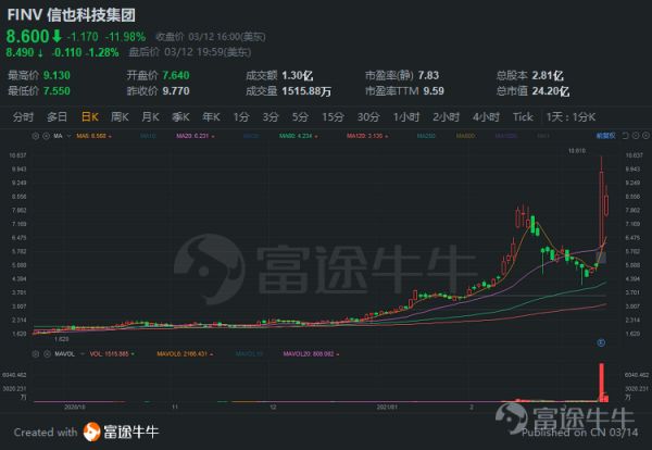 拍拍贷母公司信也科技2020年第四季度净收入为18.53亿元,同比增长50.3%;净利润为4.97亿元,同比增长20.6%;2020全年公司净收入75.63亿元,同比增长26.8%;净利润19.69亿元,同比下降17.1%。受财报和乐观预期多重影响,公司本周大涨72.69%,一跃成为仅次于360数科的金融科技类公司。