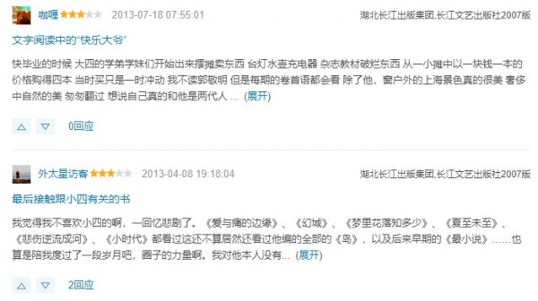 其中一位说:“回头看,书里的很多情节设置并不合逻辑,比如主角常常莫名其妙就’死’了,有一种’为悲而悲’的感觉。”另一位说:“如果穿透浮夸的文字表象,里面的情感还是很’好哭’的。《小时代》里几个人虽然阶层不同,性格各异,但彼此依赖互相需要,这种情谊甚至比爱人之间的情感更加动人。年轻人会一厢情愿地被吸引——即使现实生活有种种不开心,但内心深处依然向往’小四’所描绘的纯粹的忠诚和守护。”