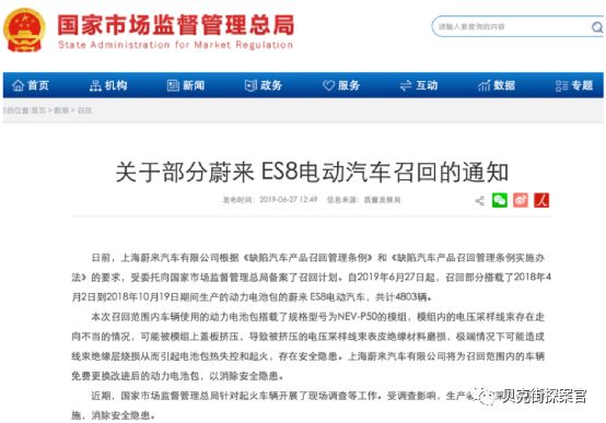 密集的蔚来自燃事件也引来国家监管部门的关注。第三起自燃发生的13天后,国家市场监管总局发布了关于蔚来召回部分ES8的通知:上海蔚来汽车有限公司申请召回从2018年4月2日到2018年10月19日期间生产的4803辆ES8。