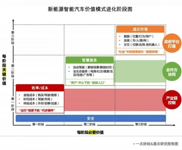 如上图所示,新能源智能汽车的价值模式存在三个阶段的进化。每个阶段其带给用户的关键价值不同,故企业“卡位姿势”也不同。