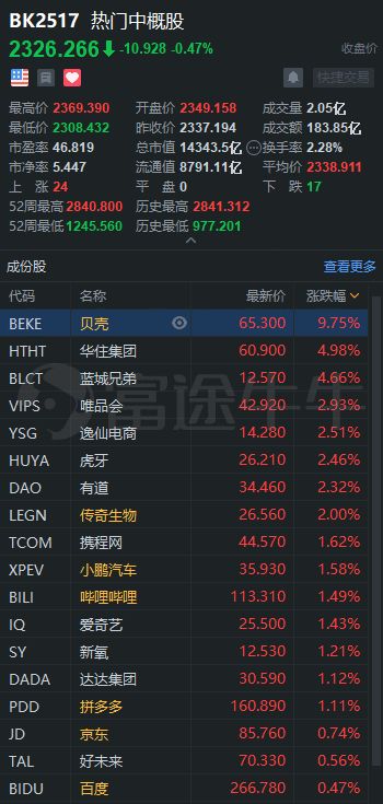 知名中概股中:贝壳涨9.75%;华住集团涨4.98%;小鹏汽车涨1.58%;哔哩哔哩涨1.49%;拼多多涨1.11%。
