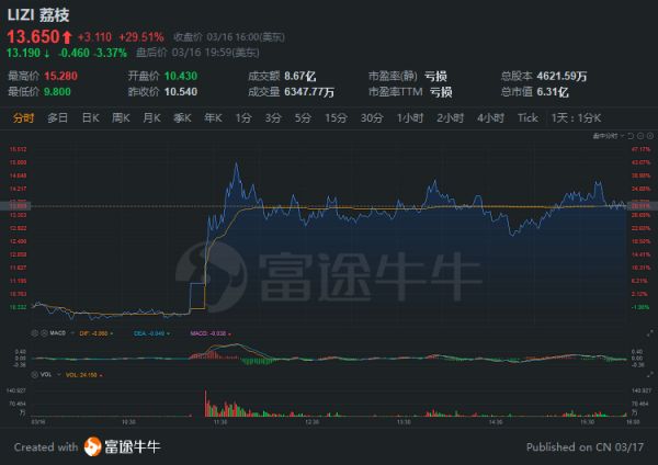 周二美股收盘,荔枝大涨29.51%,报13.65美元,总市值约6.31亿美元。