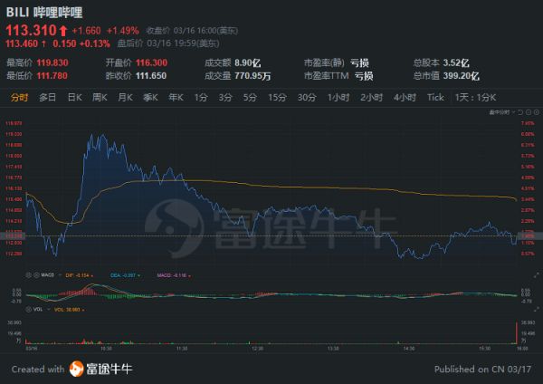截至收盘,哔哩哔哩涨1.49%,报113.31美元,总市值近400亿美元。
