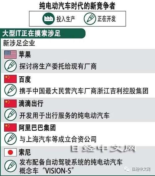 寻求涉足的并非只有苹果。在中国,大型IT企业和汽车厂商展开合作。阿里巴巴集团与大型汽车厂商上海汽车等成立了纯电动汽车合资企业。网约车大型企业滴滴出行和百度也与大型汽车企业展开合作。此外,智能手机厂商小米也表示正讨论涉足纯电动汽车业务。